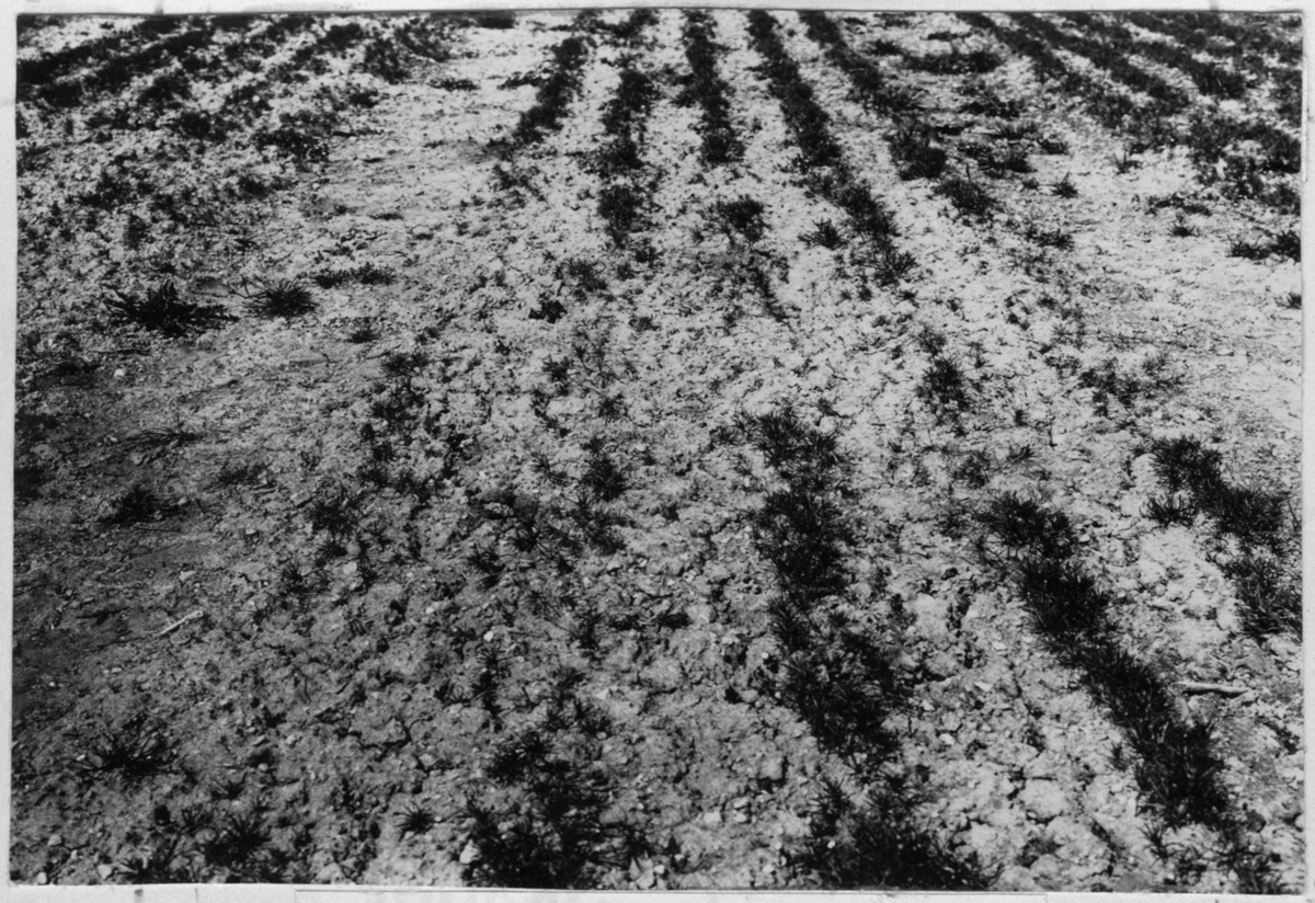 'Bildtext: ''Uppfrusna 1-åriga tallplantor i plantskola.'' Närbild på små tallplantor i odling. :: :: Fotonr. 7047:2-23 indelad under rubriken ''Atmosfäriska skador på skogen, skogseld och släckning därav.'' Ingår i serie med fotonr. 7046:1-383, 7047:1-33 och 7048:1-67 med bilder från Länsjägmästare John Lindners bildarkiv.'