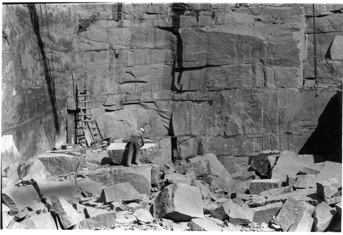 'Vy med manlig stenhuggare i arbete med stort stenblock. Vy med stora huggna block liggande spridda och i bakgrunden bergvägg med huggmärken. Stege lutad mot berget. Stenindustri. :: :: Ingår i serie med fotonr. 7057:1-8.'