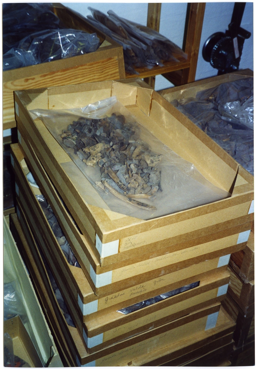 'Bildtext: ''Exempel på sanerade benfynd från Gamla Lödöse, paketerade i perforerade PE-påsar.'' Benmaterial liggande i pappkartonger. :: :: Ingår i serie med fotonr. 7049:1-15 ''Fotodokumentation av mögelsanering och av lokaler i källaren.'''