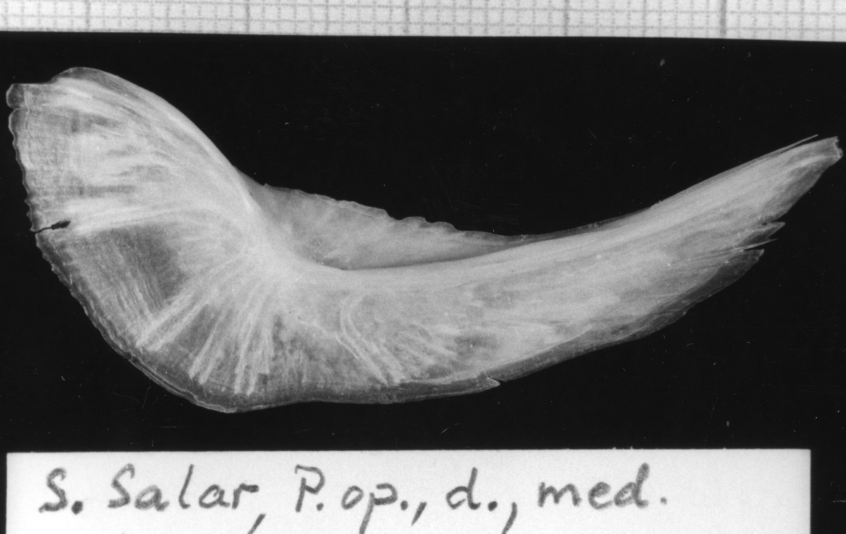 'S. salar, P. op., d., med. :: (Salmo salar, Praeoperculum, dexter, medialt) :: :: Ingår i serie med fotonr. 7094:1-48'