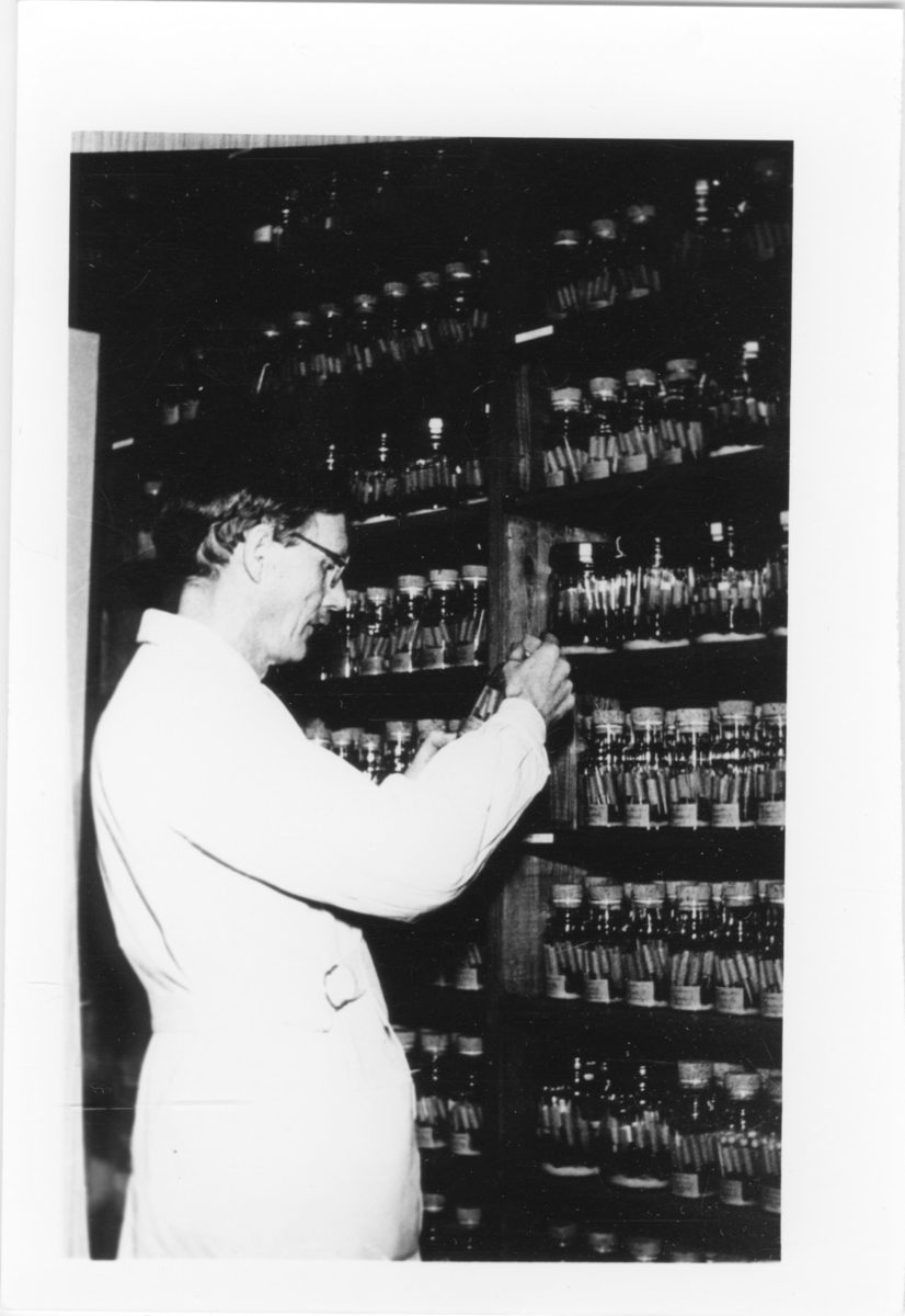 'Hans Lohmander stående framför skåp med glasburkar med provrör med preparat. :: :: Ingår i serie med fotonr. 7114:1-3.'