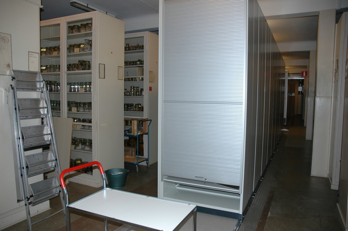 'Gamla magasinet efter renovering och insättande av nya kompaktskåp. :: :: Fotonr. 7095 består av en bildserie som dokumenterar diverse utrymmen i byggnaden så som kontor, arbetsplatser, arbetsrum, magasin m.m. Bilder tagna före och efter olika ombyggnationer bl.a.'