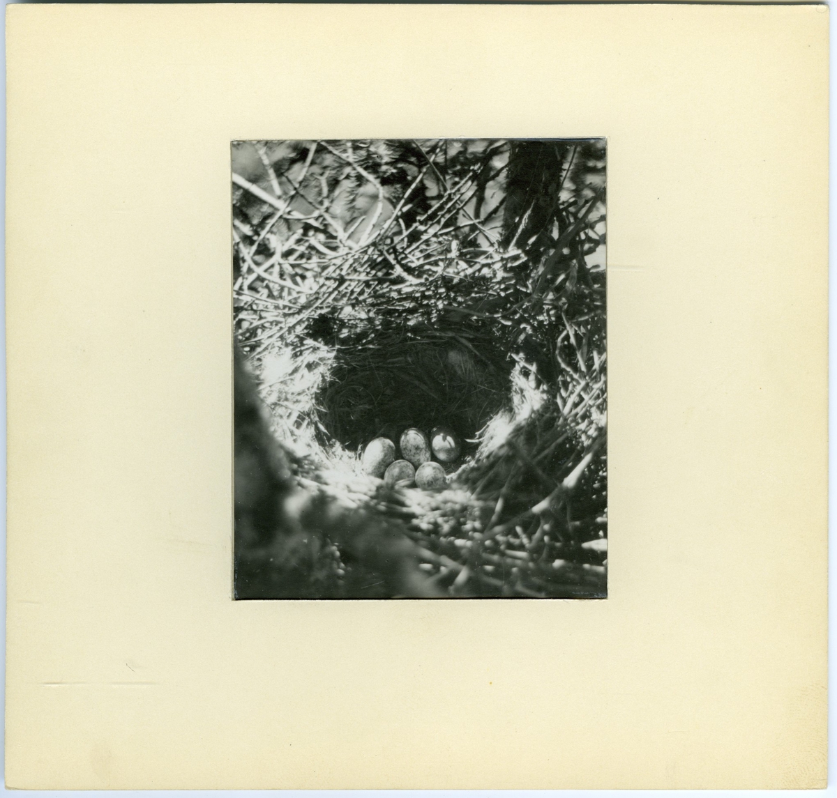 'Bildtext: ''Bo av kråka.'' :: Närbild på bo med 5 ägg av kråka. :: :: Ingår i serie med fotonr. 7083:1-55.'
