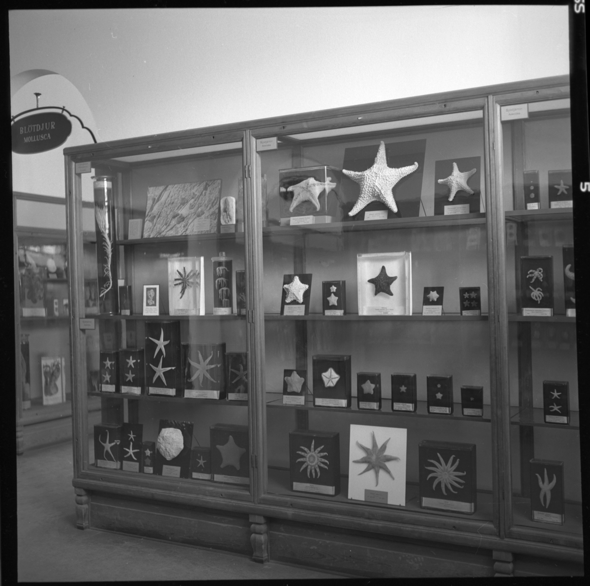 'Monterskåp med diverse preparat i glasbehålllare av sjöstjärnor. På skylt i gången står ''blötdjur (Mollusca)'' som finns bakom väggen. :: :: Ingår i serie med fotonr. 7120 med diverse bilder från Hans Lohmander.'