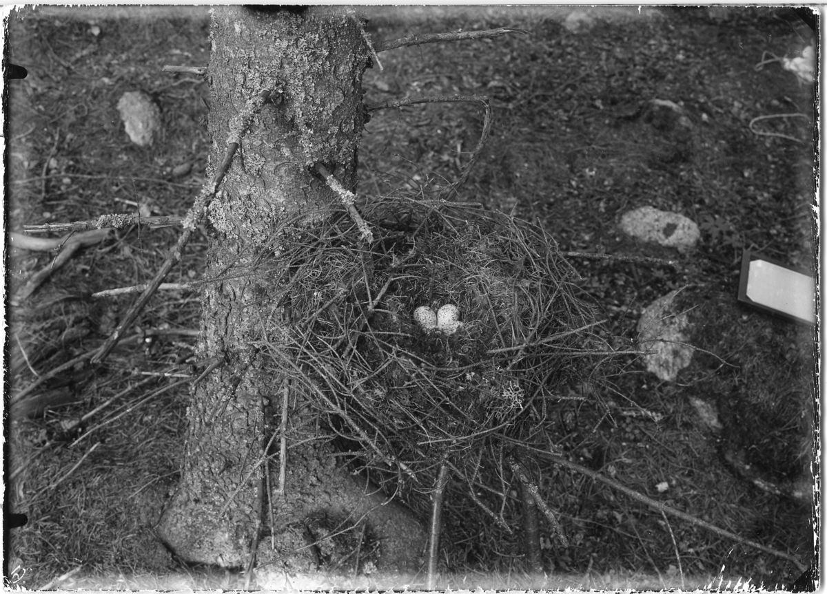 Skogsnäppa, bo med ägg, intill granstam.