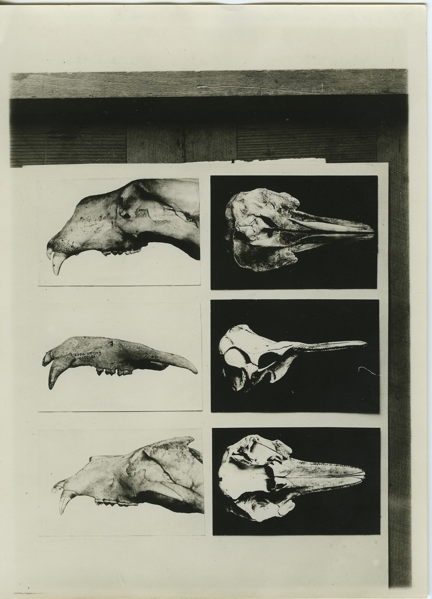 'Till vänster, uppifrån och ner: :: 1) Överskalle av isbjörn, Spetsbergen. 1862-11-25. :: :: 2) Vänster överkäke med angränsande ben. :: :: 3) Överskalle av björn. 1844-04-15. :: :: Se även fotonr:1043:2 samt 678, 679 och 680'