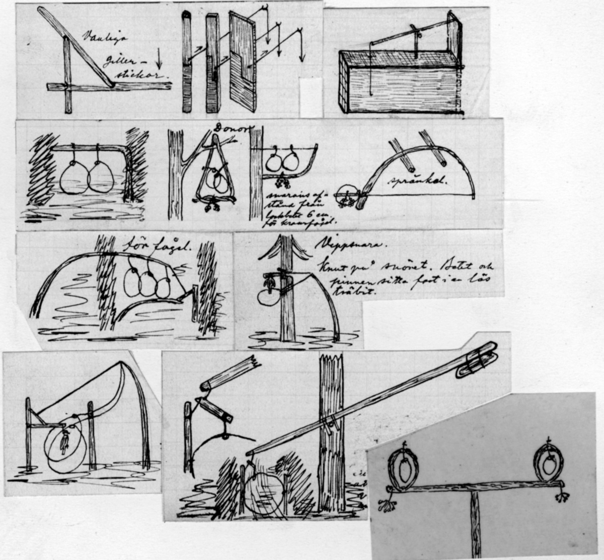 'Teckningar, skisser av diverse fångstredskap, fällor. :: :: Fotonr. 7048:59-66 indelad under rubriken ''Jakt och djurfångst, jaktbytets behandling''. Ingår i serie med fotonr. 7046:1-383, 7047:1-33 och 7048:1-67 med bilder från Länsjägmästare John Lindners bildarkiv.'