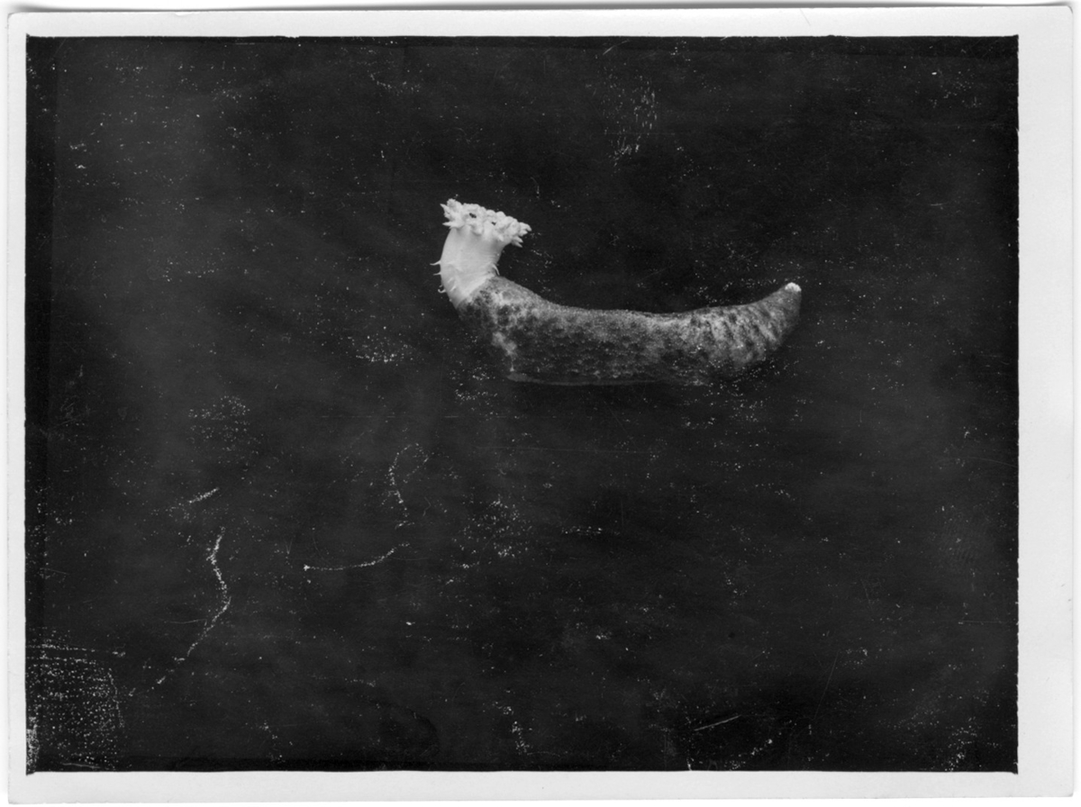'Preparat troligen insamlade under Leonard Axel Jägerskiölds inventeringar i Kattegatt, :: :: Lergök (sjögurka) sedd från sidan. :: :: Ingår i serie med fotonr. 7080:1-9.'