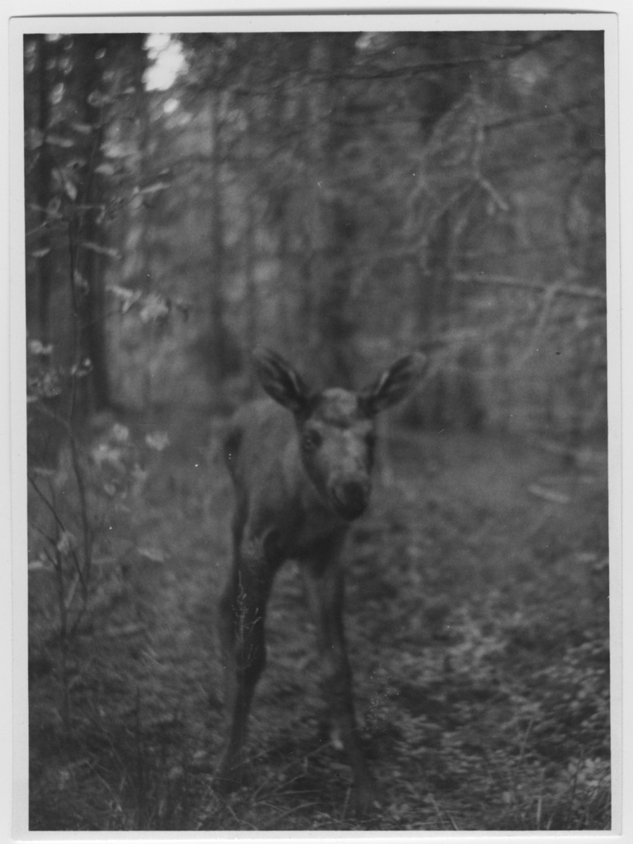 'Älgkalv, han, ca 1 vecka gammal, sedd framifrån. :: :: Se även fotonr. 4678:1.'