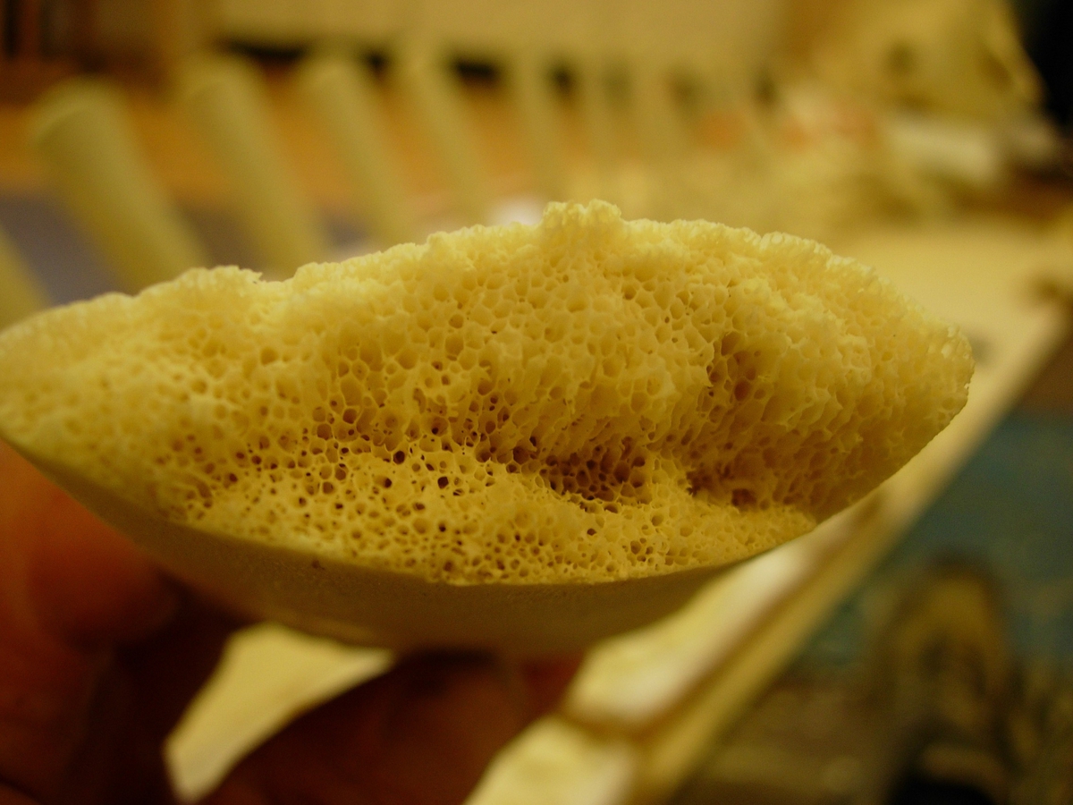 Titel: 'Monteringsarbetet med näbbvalen, hane, Valders skelett. :: Närbild på porerna i avbruten skelettbit. :: :: Skelettet till näbbvalen är monterat och hänger i valsalen på Göteborgs Naturhistoriska Museum. Då näbbvalen sågs utmed kusten kom den att kallas Valder i media. :: :: Ingår i serie med fotonr. 7106 med bilder på näbbvalen som levande och under arbetet med att montera skelettet.'