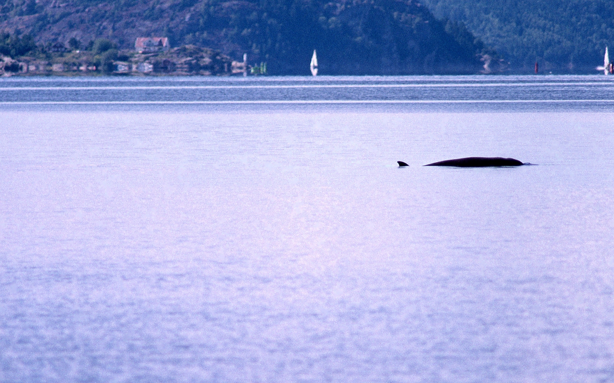 'Näbbvalen ''Valder'' i havet, vy med segelbåtar och land med hus. :: :: Skelettet till näbbvalen är monterat och hänger i valsalen på Göteborgs Naturhistoriska Museum. Då näbbvalen sågs utmed kusten kom den att kallas Valder i media. Fynddatum: 2004-09-04. Näbbvalen uppmärksammades ca 2 veckor innan den avled. :: :: Ingår i serie med fotonr. 7106 med bilder på näbbvalen som levande och under arbetet med att montera skelettet.'