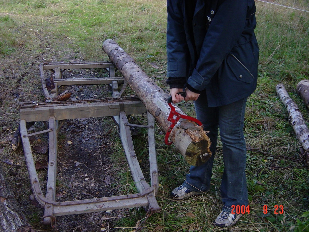 'Skogsarbete. 1 person håller en stock, intill timmerkälke. :: :: Ingår i serie med fotonr. 7113:1-9 med bilder från lektionen ''Brossla, Björna, Lunna''.'