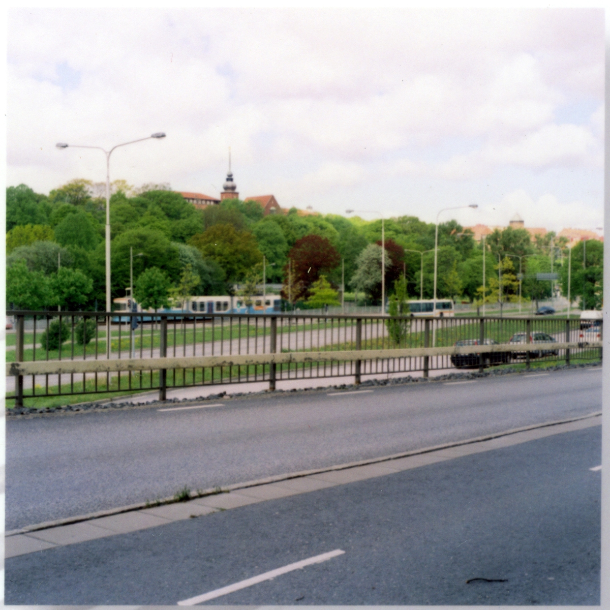 'Vy från nedanför Annedalskyrkan ut mot Linnéplatsen med Dag Hammarskiöldsleden med bilar. Spårvagn på avstånd. :: Ingår i serie med fotonr. 7129:1-5 med bilder tagna för projekt ''Då och Nu'' inom bildaccessprojektet, produktion för vastarvet.se. Detta motiv jämfördes med gamla bilden med fotonr 936. Bildtext där: :: Vyn förevigades 1926 av greve Arvid Posse. Detta var tre år efter invigningen av Naturhistoriska museet som syns på höjden. Tornet bakom museibyggnaden tillhörde det första ålderdomshemmet i Sverige, Stiftelsen Ålderdomshemmet i Göteborg från 1896. Detta ålderdomshem ersattes under 1970-talet av Vegahusen med samma funktion. Säröbanan började trafikeras med ångloksdrivna tåg 1904 och gick då mellan Särö och stationen, en bit ifrån Linneplatsen. Det var speciellt under sommaren som det var populärt att åka ut till Särö för att bada, men i mitten av 1960-talet gick det sista tåget längs sträckningen. :: :: Vegetationen kring Naturhistoriska museet har naturligt nog växt upp och sommartid skymtas bara spira och taknock av byggnaden, här sedd från Annedalskyrkan. Idag går spårvagnsspår och Dag Hammarskiöldsleden parallellt med Säröbanan.'
