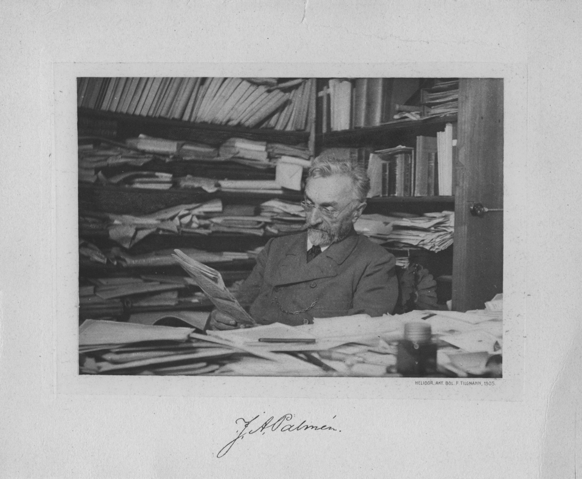 Porträtt av J. A. Palmén sittande vid skrivbord studerande tidning eller dyligt. Skrivbordet fullt med papper. I finden bokhyllor fyllda med böcker och papper.