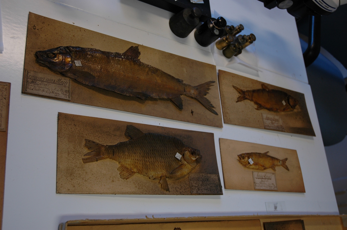 'Överst till vänster torkat skinn av sik från Vänern, Vänersborg år 1857 Pi.su. nr. 1023 samt 2 andra torkade fiskskinn. :: :: Ingår i serie med fotonr. 7005:1-8 med foton av fiskar bevarade genom torkning, framtagna för rengöring av konservator.'