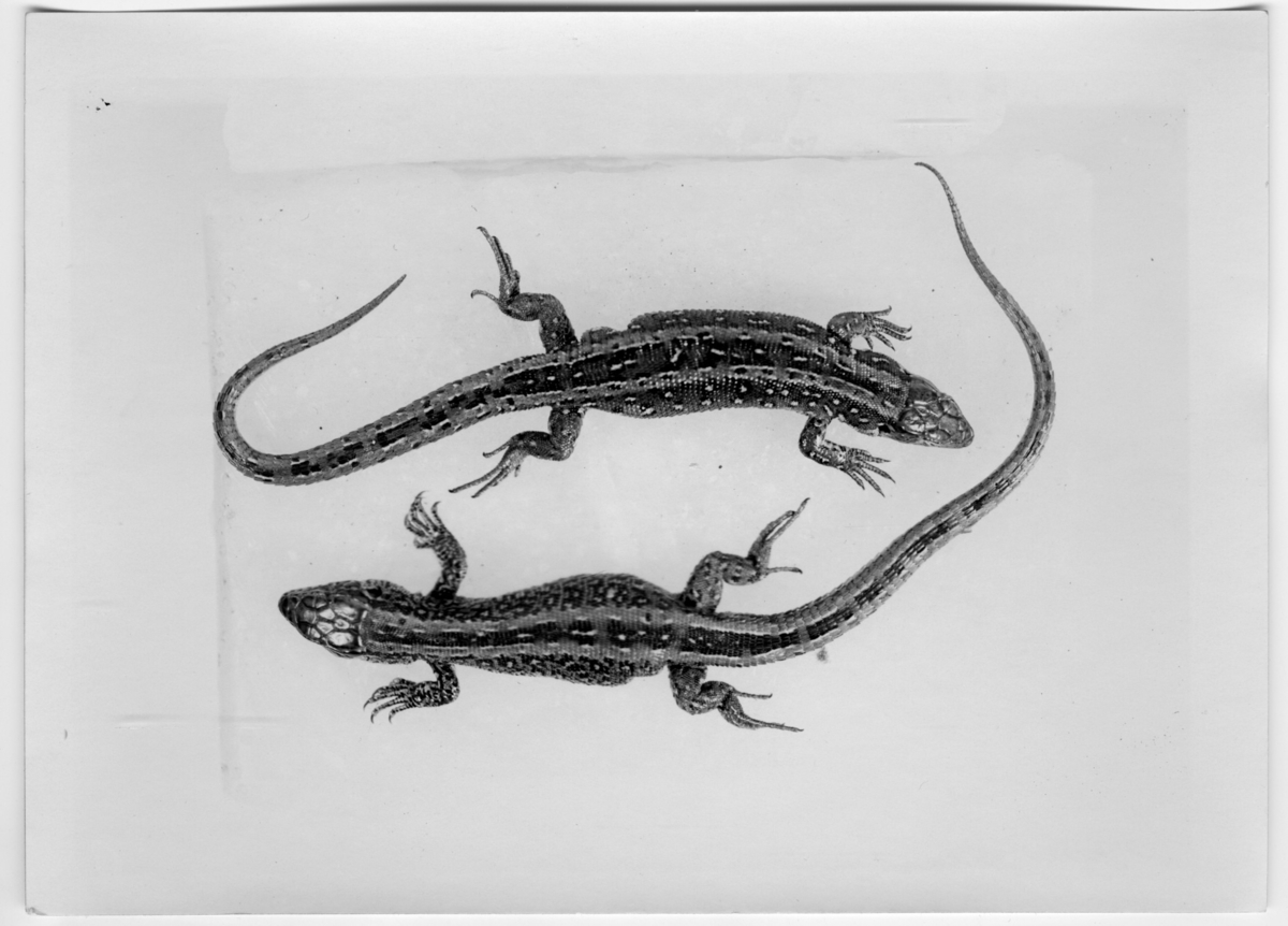 '2 ödlor, hona överst, hana underst. :: :: Ingår i serie med fotonr. 7015:1-91 med bilder av reptiler från Otto Cyréns samling.'