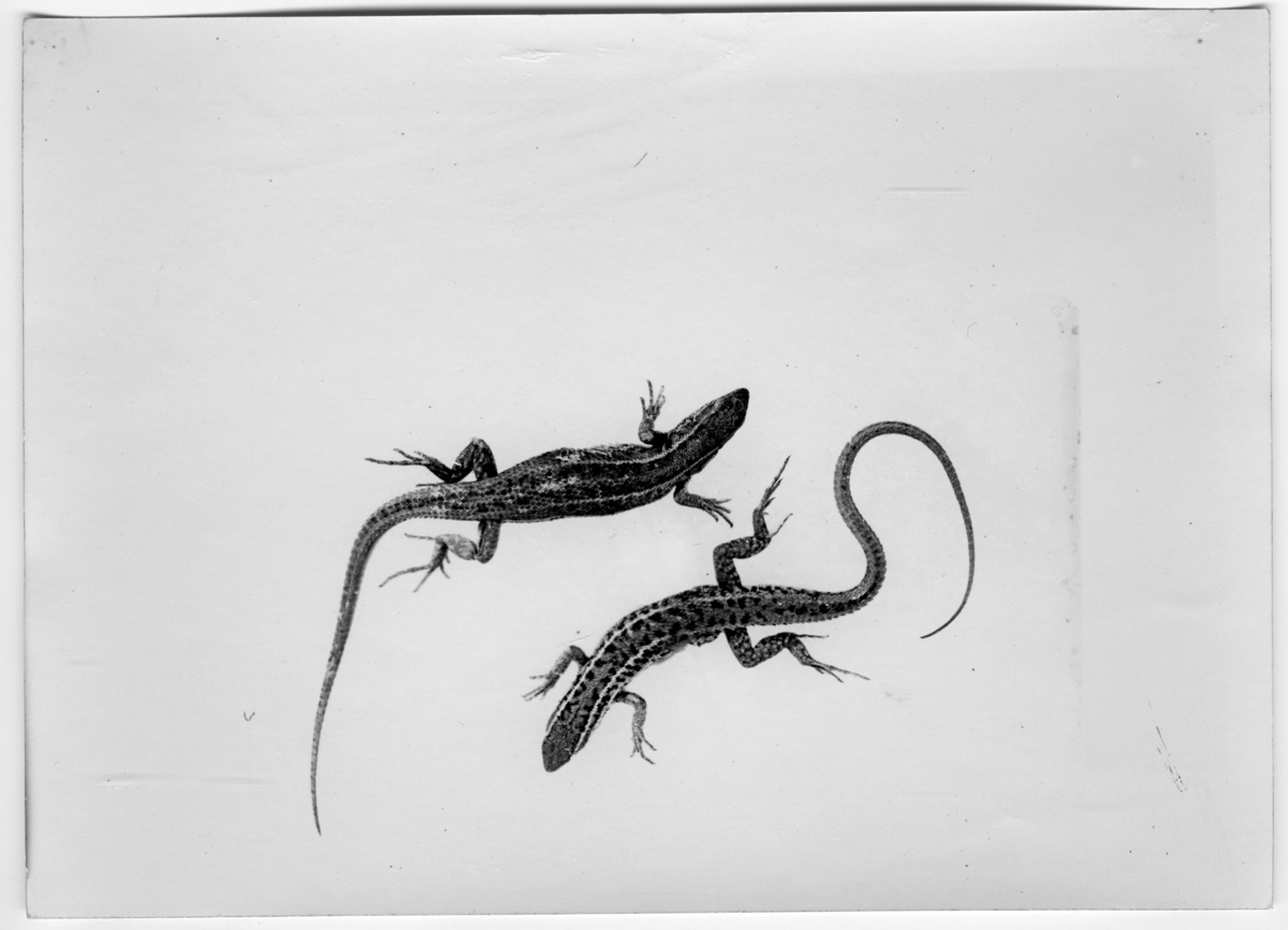 '2 ödlor, hona och hane. :: :: Ingår i serie med fotonr. 7015:1-91 med bilder av reptiler från Otto Cyréns samling.'