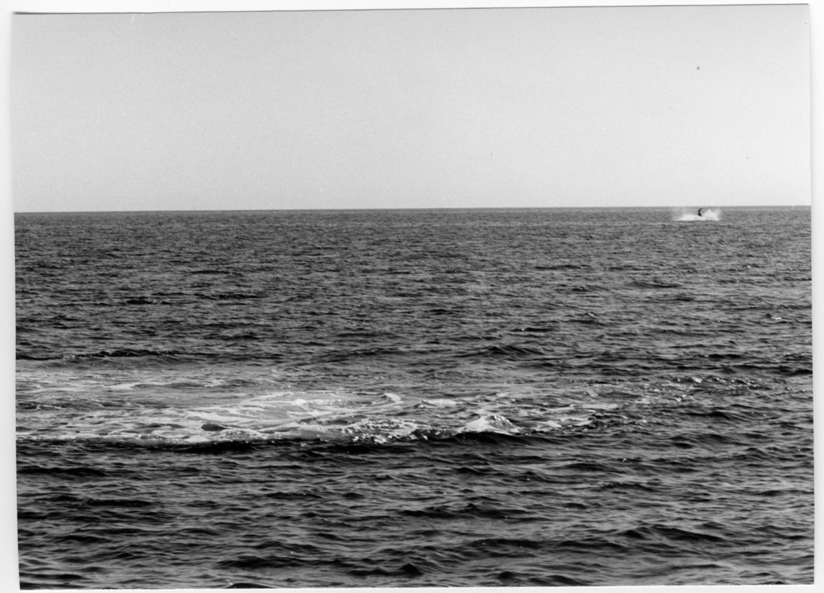 'Brugd på avstånd i vattnet. :: :: Ingår i serie med fotonr. 7041:1-3 med foton av hoppande brugd. Tillhörande korrespondens finns.'