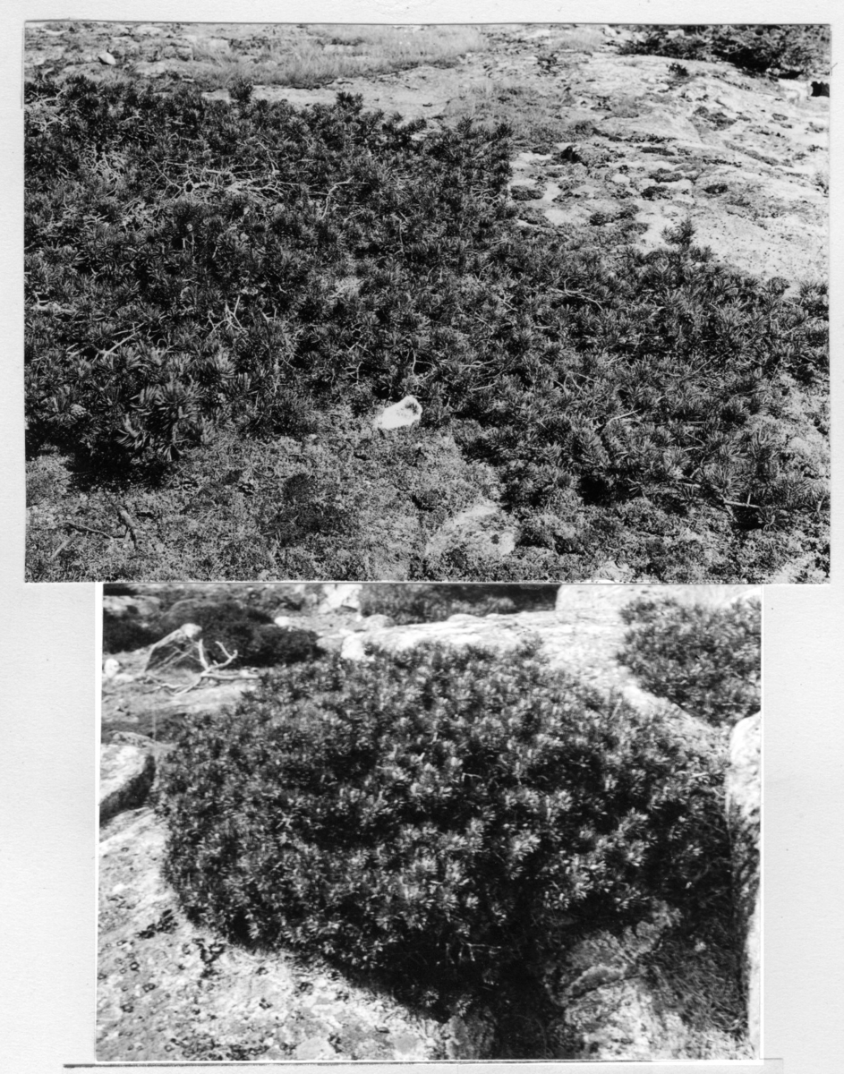 'Bildtext: ''Mattformig tall. Tuvformig tall.'' Närbild på krypande tallar. :: :: Fotonr. 7046:119-185 indelade som ''Märkvärdiga träd i Göteborgs län och Bohus län''. Ingår i serie med fotonr. 7046:1-383, 7047:1-33 och 7048:1-67 med bilder från Länsjägmästare John Lindners bildarkiv.'