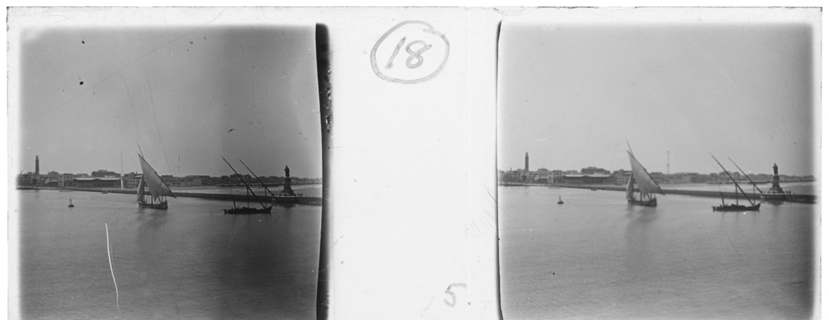 'Vy in mot land med pir och byggnader, staty till höger. Segelbåtar i förgrunden. :: Enligt text till fotot: ''N. end of Camal, Lessep´s statue.'' (N. slutet av Camal, Lessep´s staty.) :: :: Ingår i en serie med fotonr. 5241:1-18. Se även fotonr. 5237:1-16, 5238:1-18 och 5239:1-18, 5240:1-17.'