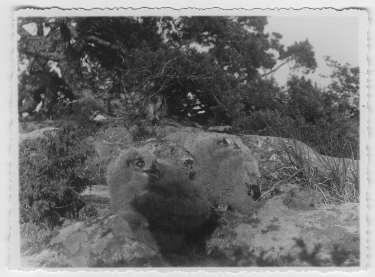 '2 st berguvsungar sittande på berghäll. :: :: Ingår i serie med fotonr. 4210:1-3.'