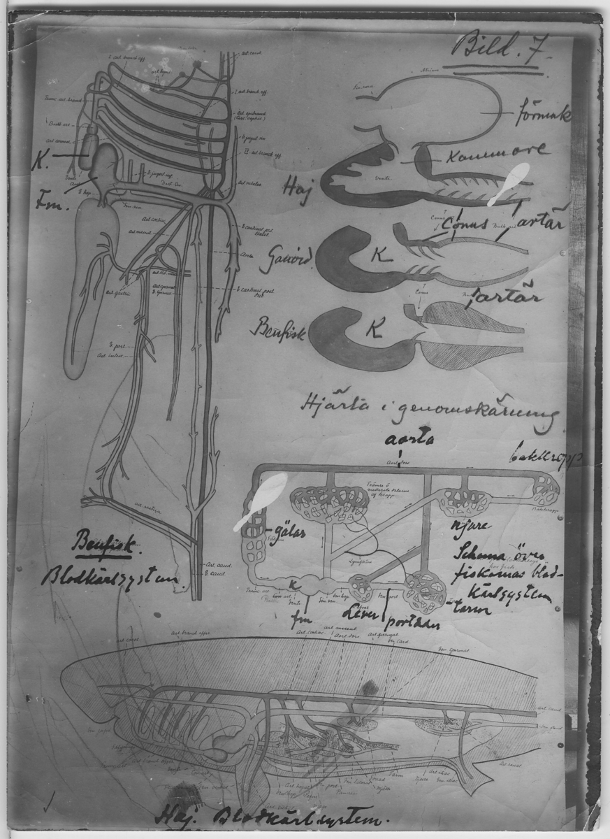 'Teckning av blodkärlsystem hos benfisk respektive haj samt hjärta i genomskärning hos haj, ganoid samt benfisk. Även schema över fiskarnas blodkärlsystem. Latinska namnen på organens delar utsatta. :: Anteckning ''Bild 7'' och handskrivna anteckningar i bläck och blyerts på ett exemplar. :: :: ''Fotografier använda vid dissektionskursen våren 1928'' . :: Avfotograferade teckningar på skelett och organ. :: På baksidan av vissa står det Kerstin Nyblén :: V.T.-18 :: ur bok'