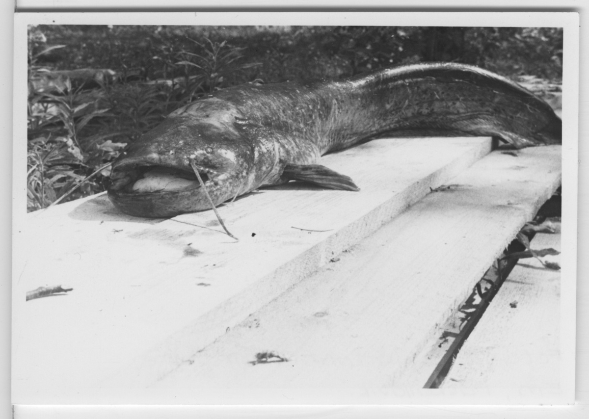'Mal som ligger på träplankor. Fisken sedd snett framifrån. :: :: Ingår i serie med fotonr. 4550:1-4.'
