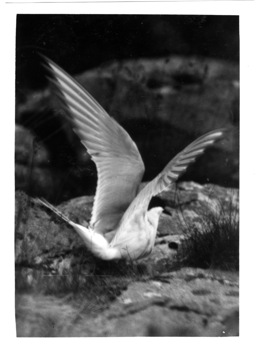'Fisktärna slår sig ner på boet på berghäll. :: Text till fotot: ''Ruvande fisktärna vid Ellwsäg Sinöla?''. :: :: Ingår i fotonr. 6995:1-51, dessa sitter i ett fotoalbum med tillhörande beskrivningar på norska.'