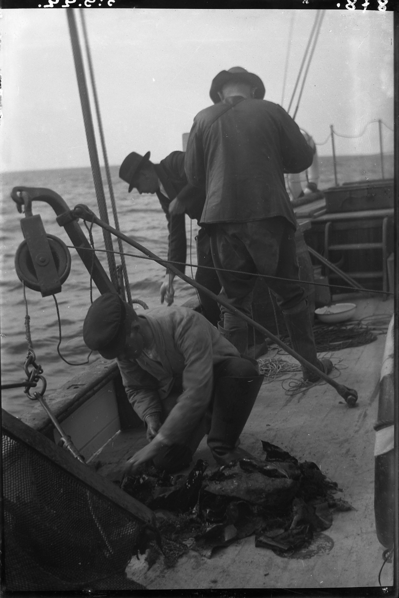 'Från skrapturen med båten ''Sven Lovén'' utanför Göteborg: :: 3 män på båtdäck, vid hissanordning. :: :: Ingår i serie med fotonr. 878-882.'