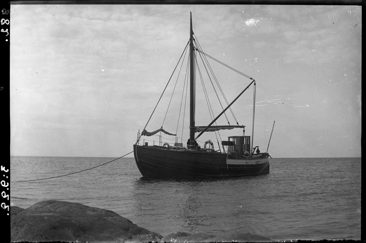 'Från skrapturen med båten ''Sven Lovén'' utanför Göteborg: :: Vy med båt på avstånd. Nära land med berghäll, ev. förankrad. Livboj. Mast. :: :: Ingår i serie med fotonr. 878-882.'