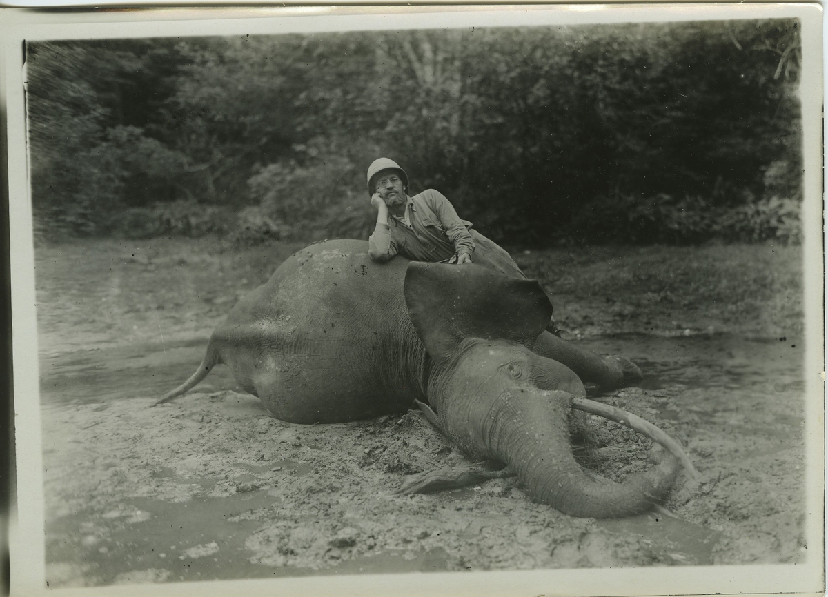 'Elefant, hona skjuten. Kroppen liggandes på sidan, 1 st man (S. Molin?) står lutad mot djuret. :: :: Serie fotonr 983-996'