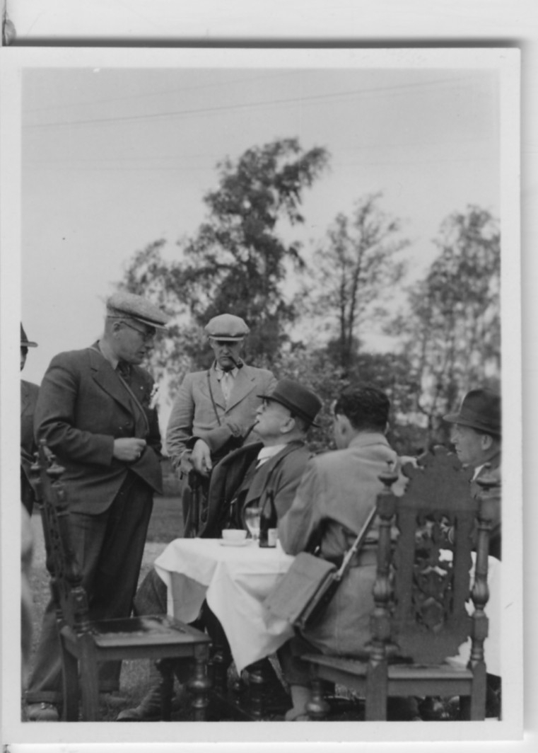 'Biologiska föreningens utfärd till Sveafallet och Villingsbergs Kronopark: :: :: 5 män iklädda hatt, keps sittande och stående vid ett dukat bord med stolar utomhus. Sune Swärd (till vänster), Leonard Axel Jägerskiöld (3:e från vänster med ppipa) och till höger Folke Persson vid kaffebord, utomhus. 3 män sitter vid bordet och 2 män står bredvid. :: :: Se fotonr. 4226:1-34, 4228:1-3 och 4229:1-3 från samma utfärd.'