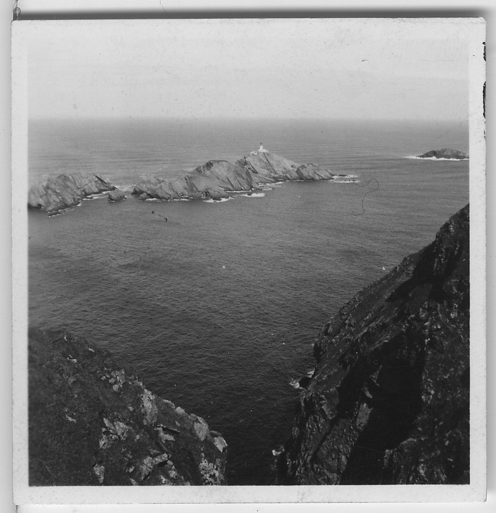 'Från ''Skageraks''-expeditionen till Hebriderna och Shetland: :: :: Vy över Muckle Flugga, den nordligaste klippan bland de brittiska öarna. Synlig är fyren som stod klar 1854 (förstorad version av foto nr 4113:79) :: :: Ingår i serie med fotonr. 4113:1-82.'