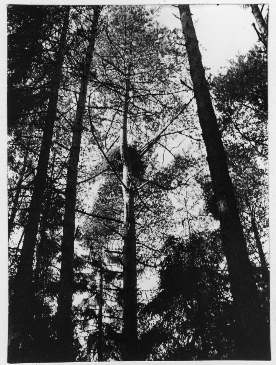 'Bildtext: ''Bo av duvhök (Astur palumbarius).'' Vy upp mot trädkrona med bo av duvhök. :: :: Fotonr. 7048:27-37 indelad under rubriken ''Naturstudier''. Ingår i serie med fotonr. 7046:1-383, 7047:1-33 och 7048:1-67 med bilder från Länsjägmästare John Lindners bildarkiv.'