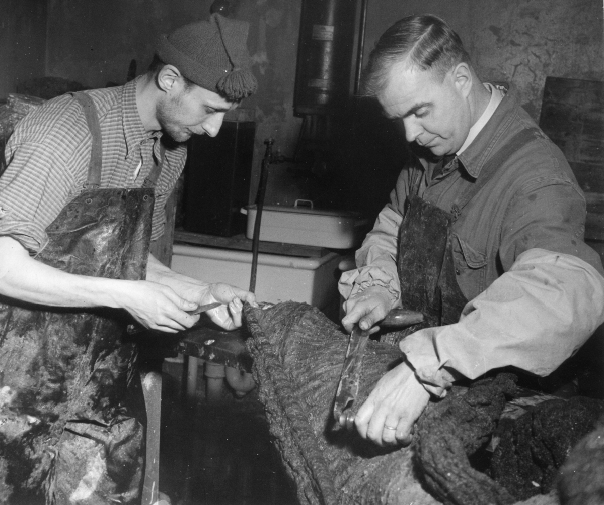 'Monteringen av Göteborgs Naturhistoriska museums elefant från Angola. :: :: 2 män arbetar med tunnskärning av elefantskinnet. :: :: Fynddatum: 1948-12-04. Elefanten skjuten och monterad av David Sjölander. :: :: Elefanten finns utställd på Göteborgs Naturhistoriska Museum i däggdjurssalen. :: :: Ingår i serie med fotonr. 4576:1-18.'