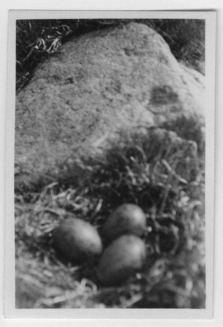 'Text enligt foto: ''Bo med 3 st ägg av fiskmåsen vid en sten ute i vattnet i Knisa mosse. På andra sidan flög en gräsandhona upp ur sin rede på 7 st nyvärpta ägg.'' :: :: Ingår i serie med fotonr. 4500:1-172.'