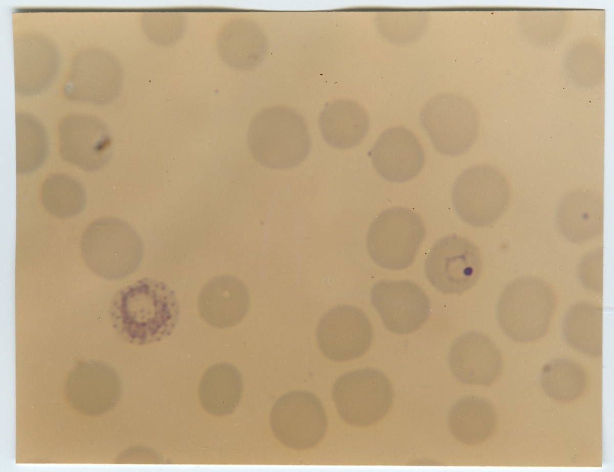 'Mikroskopbilder på amöba: :: Text på baksidan av fotot: ''Trophozoite of Plasmodium falciparum and Plasmodium vivax in the same field. Note that the cell containing P. vivax is enlarged and strippled with schuffner´s dots x 2000. 95-05 1.45'' :: :: Ingår i serie med fotonr. 5653:1-16.'
