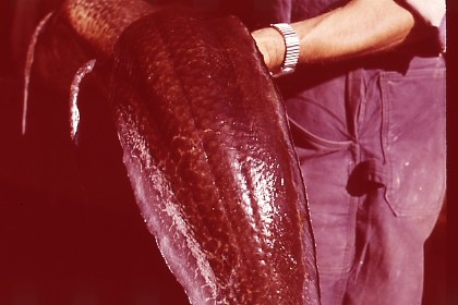 'Bilder en död lungfisk från akvariet. Avgjuten och placerad i basutställningen på Göteborgs Naturhistoriska museum, 1960. Avgjutningen gjord av Björn Wennerberg. :: :: 1 person håller i fisken, ryggsidan av fisken fotograferad.'