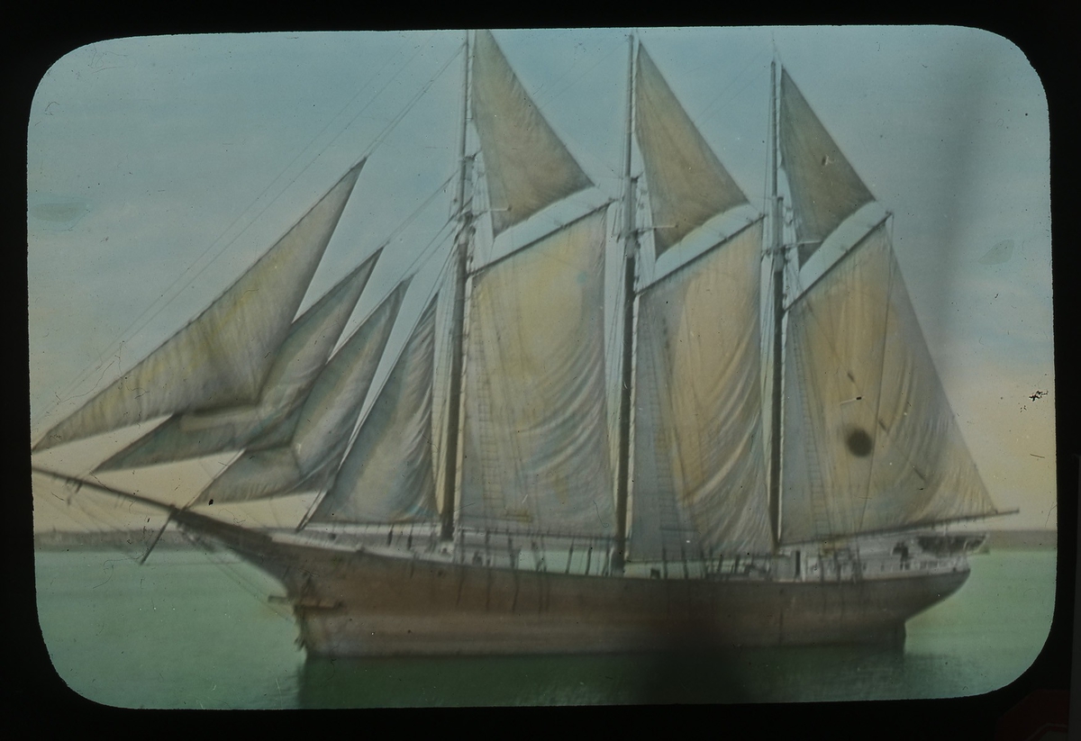 'Stor båt, fartyg med segel. :: Text på glaset: ''A fishship schooner in Pasama?uoddes Bay. L.B.'' ''Department of the interior. Natural resourses intelligence service.'' :: :: Ingår i serie med fotonr. 5202:1-10 med färgdia från Nova Scotia. Se även hela fotonr. 5202-5218 med bilder från Frits Johansen.'