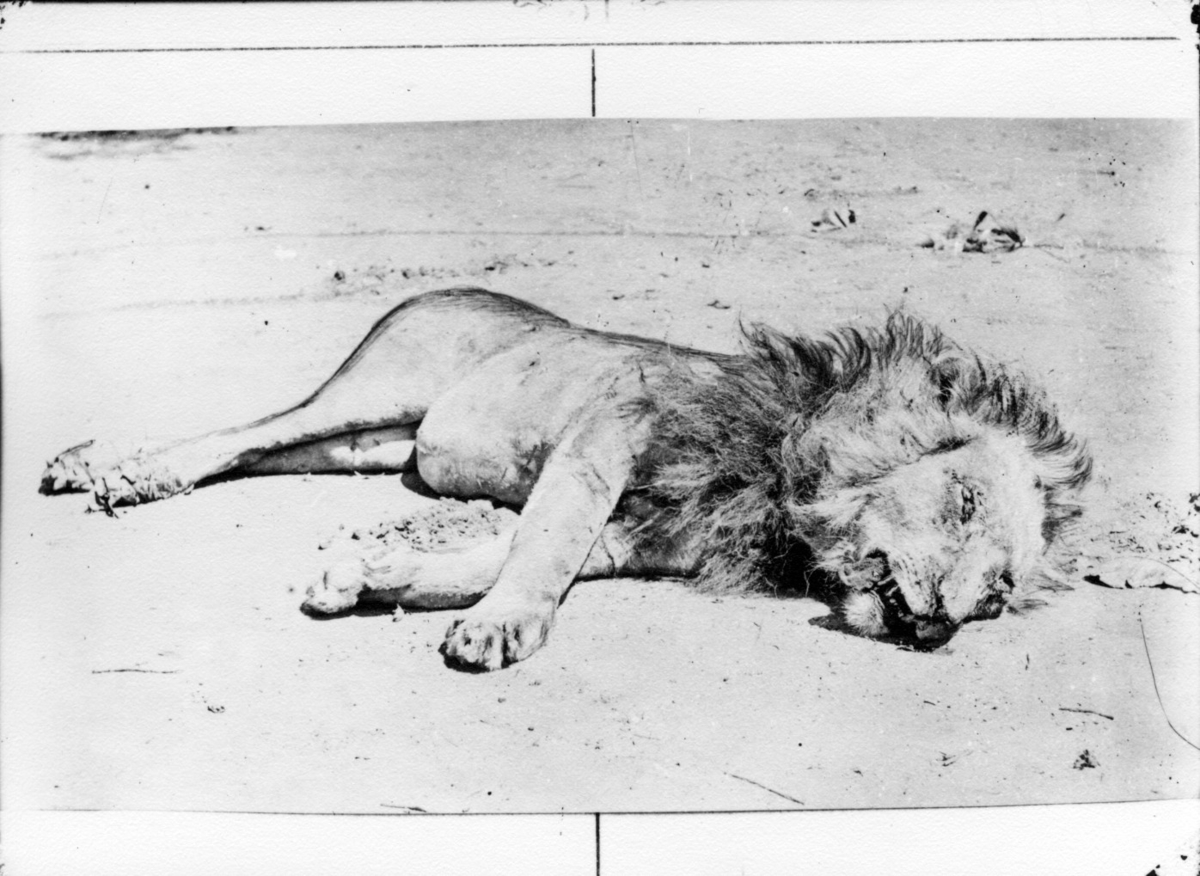 'Diverse fotografier från bl.a. dåvarande Nordrhodesia, nu Zambia, tagna av Konsul Magnus Leijer. :: :: Ett fällt lejon liggade på sidan på marken. Fotograferad från nära håll.'