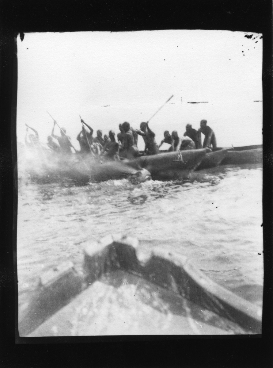 'Diverse fotografier från bl.a. dåvarande Nordrhodesia, nu Zambia, tagna av Konsul Magnus Leijer. :: :: Ett flertal människor i båtar, arbetar med spett ner i vattnet (jagar?) i förgrunden är fören hos fotografens båt synlig.'