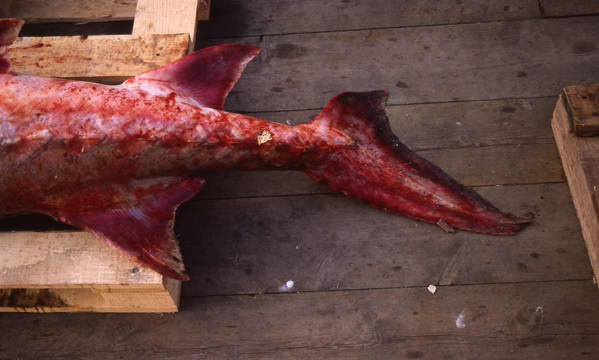 'Stör fångad i Nordsjön: :: :: Närbild på stjärtparti. Stjärtfena. :: :: Ingår i serie med fotonr. 6029:1-12. Se även fotonr. 6028.'