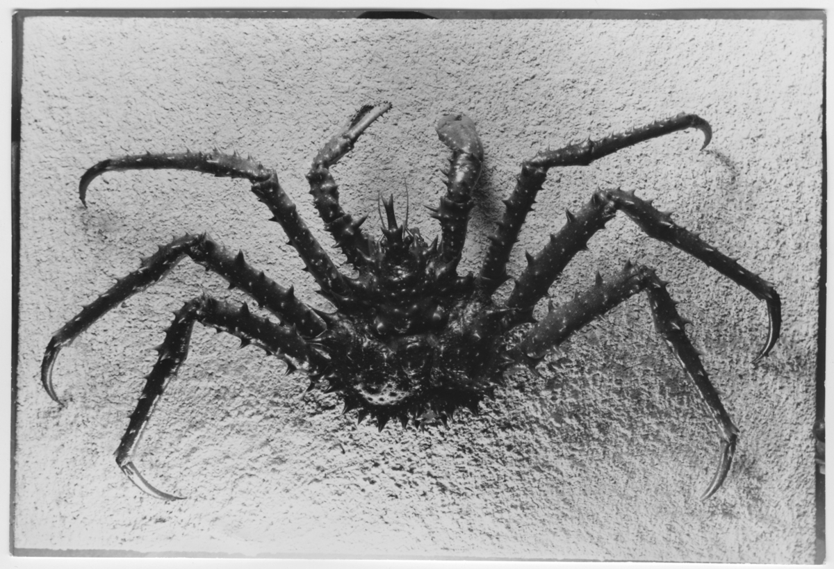 'Text enligt foto: ''Västkustens ståtligaste krabba. Den scharlakansröda ''trollkrabban'', Lithodes maja, fångas i räkfiskares trålar på större djup vid Bohusläns kust och i Skagerack. Insamlad under Skagerakexpeditionen 1937.'' :: :: Ingår i serie med fototnr. 5680:1-23.'
