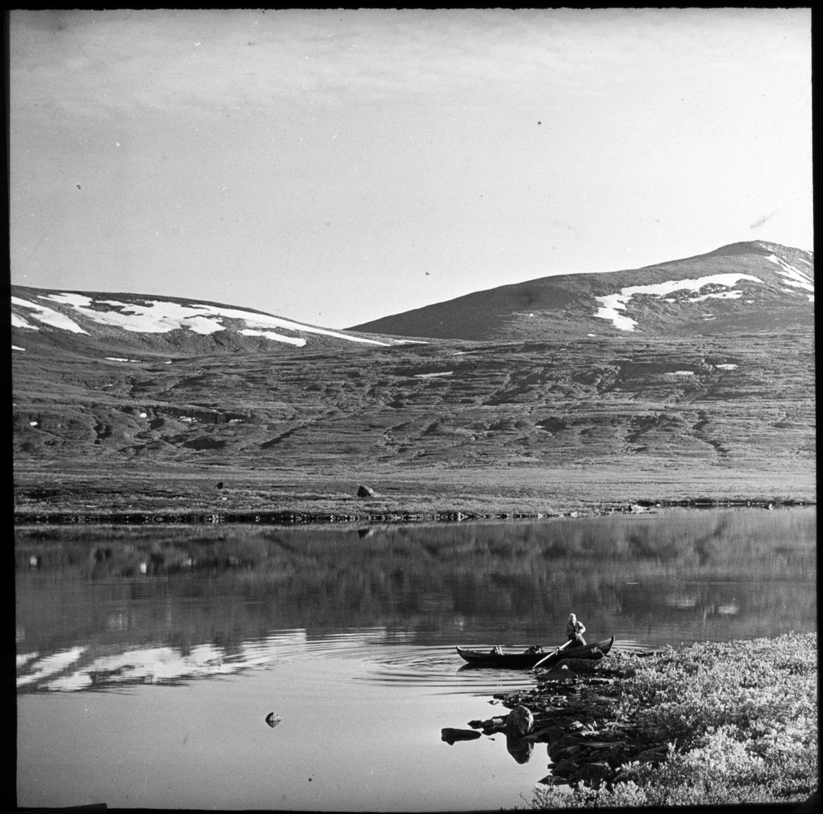 'Bildtext: ''Kirjastjåkko (till höger) från Tjålmejaure.'' Vy med delvis snöklätt fjäll, i förgrundensjö. 1 hattklädd person stående i eka invid stranden med åra i händerna. :: :: Ingår i serie med fotonr. 5167:1-8 numrerade med bildnr 231-238.'