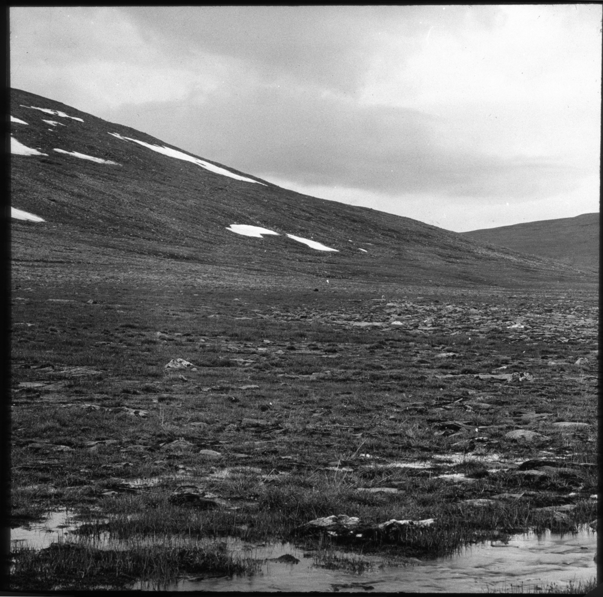 'Bildtext: ''Skärsnäppans terräng mellan Kirjastjåkko o. Svaipa.'' Vy med sjö/våtmark i förgrunden och delvis snöklätt berg. :: :: Ingår i serie med fotonr. 5166:1-8, numrerade med bildnr 223-230. Se även hela serien med fotonr. 5155-5174.'