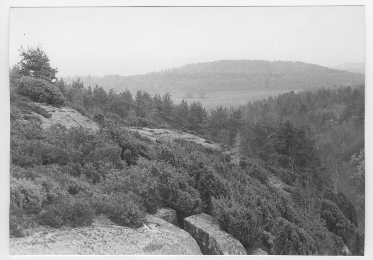 'Bildtext: ''Skogsområde. Riktning 143.'' :: I förgrunden berg med sprickor och bevuxet med enbuskar. Vy över skogsområde och berg. :: :: Ingår i serie med fotonr. 6970:1-1125, dokumentation av Hisingens naturgeografi, visande landskapsformerna i stora drag och gjord inför exploateringen av området. Platserna för fotograferingen finns utsatta på karta i skala 1:4000 som finns på Göteborgs Naturhistoriska musem. Fotoriktningen mättes med kompass i gammalgrader.'