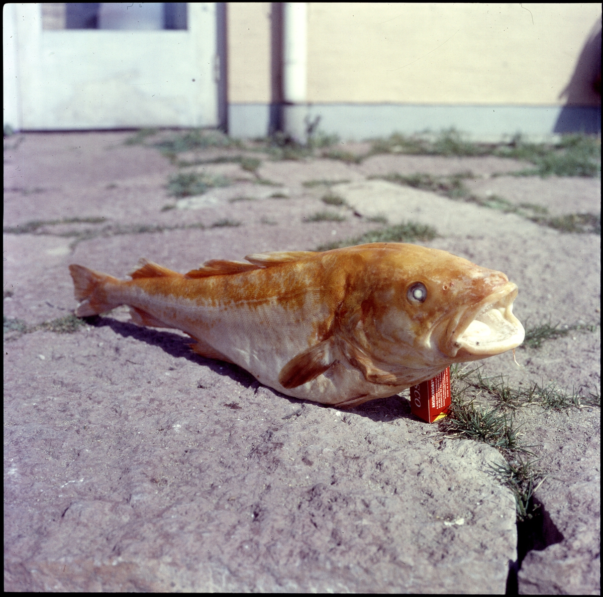 'Torsk, brandgul färgvaritet, liggande på stenplattor, sedd snett framifrån. Fynddatum 1957-04-11. Husvägg i bakgrunden. :: :: Ingår i serie med fotonr. 4676:1-6, se även fotonr. 4677:1-3.'