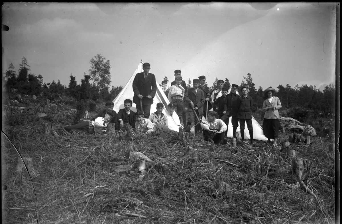'Gruppbild. 7 pojkar, unga män sittande, 9 unga män, pojkar stående och 1 kvinna stående. Samlade på ett kalhygge. Iklädda hatt, kepsar. I fonden granskog. Några pojkar håller redskap, typ av hacka. Två slags tält står uppresta bakom gruppen. :: :: Ingår i serie med fotonr. 5137 med diverse bilder. Plåtarna ligger i 2 pappaskar. På asken för negativen 9x12 cm och 12x18 cm står texten: ''Fröken Pettersson, Eksjö. Kopieras. Negativ. Alingsås samskola? m.m.'''