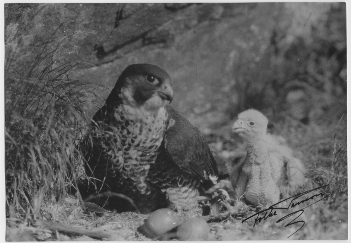 Pilgrimsfalk, hona, med 1 nykläckt unge och 2 ägg, närbild.