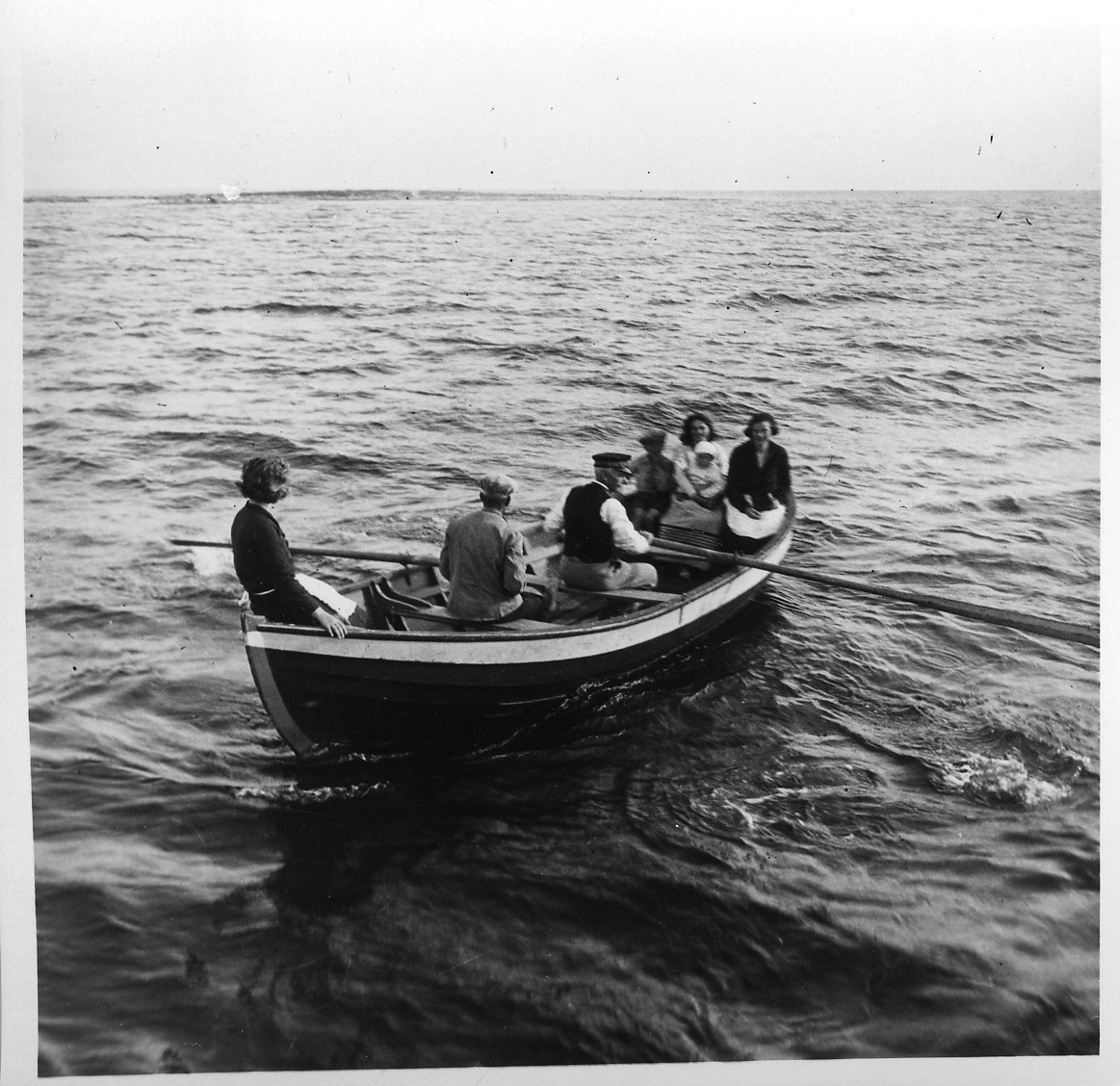 'Akka-expeditionen sommaren 1931: :: :: 7 st personer, varav 2 män, 3 kvinnor och 2 barn, i en roddbåt på öppet vatten. :: :: Ingår i serie med fotonr. 2182-2234.'